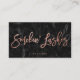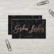 A modern, stylish lashes, eyes makeup artist business card with modern hand lettering style brush typography in faux rose gold foil on a trendy and elegant black marble background.