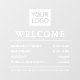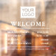 Opening hours window cling featuring white text "Welcome", your logo and your opening hours on a transparent background.