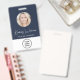 Modern professional blue ID badge featuring your employee's photo in a circle frame, their name in a chic white script and their title in simple white lettering, and your business logo. On the back, add any additional information and optional QR and bar codes.