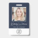 Modern and professional dark blue employee ID badge featuring their photo, their name in a stylish white script and their title in simple white lettering, and your business logo. On the back, add any additional information and optional QR and bar codes.