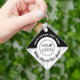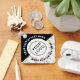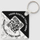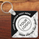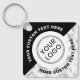Double sided keychain with your custom logo on a white, round background surrounded by circular text on the front and QR code on the back. Black and printed marble look background. Change fonts and font colors, move and resize elements with the design tool.