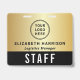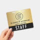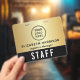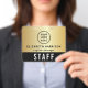 Custom access pass badge featuring logo branding, QR code functionality and an elegant black and gold background. The front showcases your logo and team member's name and title in a clean, easy-to-read layout, while the bold “STAFF” (or "CREW," "VIP," "VENDOR," etc.) designation ensures instant recognition from a distance. On the back, a large QR code provides a modern option for check-ins, credentials, schedules, or access control -- making this badge as functional as it is stylish. Perfect for corporate events, conferences, productions, and large-scale gatherings, this badge helps your team stay organized while reinforcing a polished, cohesive brand presence.