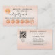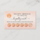 Loyalty business card featuring your own logo (if you replace the sun image) on an elegant peach pink background design with watercolor brush strokes. A row of metallic rose gold numbers can be used to punch the visits of your customer. On the back is a QR code template. A great business card for a beauty salon or other professionals in the beauty industry.