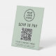 Modern sage green table top pedestal sign for your business with a QR code that customers can scan for payments, enabling you to receive payments anytime, anywhere. Upload your logo and add your business name, phone number and street address or other information in simple typography. Input your payment website address to automatically create a scannable QR code.