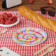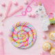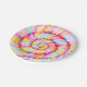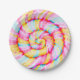 Paper plate with realistic multicolor lollipop digital illustration. Round swirl candy pink, yellow and blue colors.