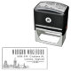 A unique self-inking stamp featuring a modern deco illustration of the city of London and its unique skyline towards the bottom corner. Towards the side is a spot for your own unique name and address information.