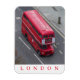 A view from above of one of the famous London red buses printed on a souvenir fridge magnet.