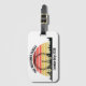 Personalised London vacation luggage tag with a silhouette of the city attractions in front of a cool sunset including the bridge, the London Eye (Millenium Wheel), and the Big Ben clock. Cool United Kingdom trip keepsake souvenir.