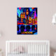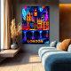 Experience London's electric vibe in this striking geometric illustration, featuring iconic landmarks like Big Ben, the vibrant city skyline, and the unmistakable red double-decker buses. Illuminated by bold neon colours and dramatic contrasts, this artwork perfectly captures the city's lively atmosphere and timeless charm. Ideal as a centerpiece for lovers of urban style, travel enthusiasts, and modern interior spaces.