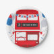 Kids' party plates with a red London bus, balloons, bunting and streamers that can be personalised with a child's name and age.