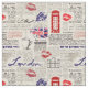 A London themed seamless pattern inspired by news papers. The "text" is actually grey dots. There background is a grey beige colour. In the pattern there are red phone booths, blue leaves, red kiss marks, "London" written in blue script font, "tea" written in grey script font, grey leaves, grey vintage style suitcases and grey sketch like teacups with steam coming up from them. There is also Union Jack in colour.