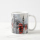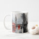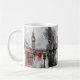 Sip your favourite drink in this elegant white ceramic mug featuring a black-and-white London cityscape, the iconic red bus, and Big Ben. A perfect gift for London lovers.