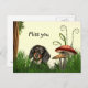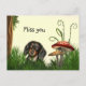 Black and tan long haired dachshund sits among the grasses and mushrooms and misses someone dog lovers postcard