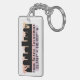 Keychain features Long Beach California city skyline silhouette with watercolor splash and latitude & longitude map coordinates
