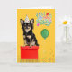 This adorable little black and tan long-haired Chihuahua sends happy wishes for the dog mom or dog lover's birthday while wearing a birthday hat and sitting among balloons and confetti.