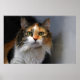 "Long-Haired Calico Cat" This gorgeous calico cat poses confidently, knowing she's beautiful. Calico cats are domestic cats with a spotted coat of three colours that is predominantly white, with patches of two other colours (often, the two other colours are orange tabby and black). Outside of North America, the pattern is usually called tortoiseshell-and-white. "Calico" refers to a colour pattern on the fur, not to a breed. Among the breeds whose standards allow calico coloration are the Manx, American Shorthair, British Shorthair, Persian, Japanese Bobtail, Exotic Shorthair and Turkish Van. Because genetic determination of some coat colours in cats is linked to the X chromosome, calicoes are nearly always female. The rare male is usually sterile. Calicos are believed to bring good luck in the folklore of many cultures. In the United States, these are sometimes referred to as money cats. The Japanese Maneki Neko figurine is almost always a calico cat. A calico cat is also the state cat of Maryland.
