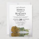 This wedding invitation is elegant, lush, and romantic. It features a gorgeous photo of a single long-stemmed golden rose lying on its side reflecting in water with waves and ripples. The back is a marbled gold or mustard yellow colour. Beautiful way to invite your friends and family to share in your special day.