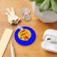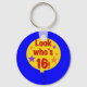 A yellow balloon, confetti stars, and text that reads "Look Who's 16!" on a blue background on 16th birthday cards, buttons, and more!