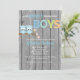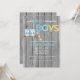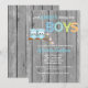 Double the Fun!!!! Look Whoo's having twin boys! Celebrate the Mother To Be with this trendy yet adorable invitation. It has a grey wood grain background. Along the top is a branch with two cute blue owls perched on the branch that has flowers on the end. Personalise with your party information in the centre. This invitation is completely customisable.