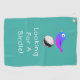 "Looking For A Birdie" with colourful bird, golf ball art and white text. Personalise this Golf Towel with your message and laugh your way around the links. Comes in several colours. Golf ball and bird art can be removed or placed in another location on the design. Teal background.