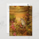 A small mouse climbing over flowers and plants up an old flowerpot looking for a new home.