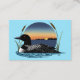 A loon on a lake with a sunset and cattails in a backdrop of blue