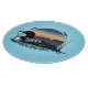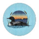 A loon on a lake with a sunset and cattails in a backdrop of blue