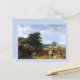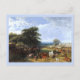 A postcard featuring a painting of a vibrant field with horses and people enjoying the serene landscape.