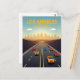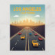 Colorful graphic illustration of a busy Los Angeles freeway with multiple lanes of traffic heading towards a distant city skyline beneath a yellow-blue sky.