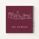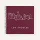 This design features a hand drawn illustration of the Los Angeles skyline on a magenta background.
