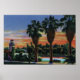 Vintage image of sunset at Echo Park in Los Angeles. Shown are three large palm trees and a small lighthouse type struction with flowering trees. Sitting on the bench overlooking the lake are three people.