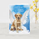 A sweet yellow Labrador Retriever dog on a sympathy card for the friend or family who've lost their friend. The angel themed dog pairs with the artist's own version of the Rainbow Bridge.