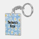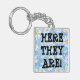 Lost keys? Where are my keys? Has anybody seen my keys? What you need is a funny keychain that shouts at you from wherever you left them last, "Here They Are!" And on the back you can put your name, so if somebody finds them and wonders whose they are... they're yours! Problem solved. This keychain even has a pretty light blue background covered with white and yellow daisies.