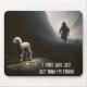 A soft glow highlights a surreal scene of a lost lamb standing on rocky ground with a shepherd following behind holding a staff