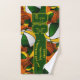 This team spirit towel for basketball players features varied size basketballs with green & gold team colours turned every which way, overlying a customisable basketball-orange background, and prominent jersey number in green overlying a full length green colour strip, upon which you can also customise the athlete's name, team name & mascot name in gold - by katz_d_zynes