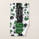 This team spirit towel for soccer players features varied size green & black team colours soccer balls turned every which way on a white background with prominent jersey number in green overlying a full length black colour strip, upon which you can also customise the athlete's name, team name & mascot name in white - by katz_d_zynes