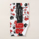 This team spirit towel for soccer players features varied size red & black team colours soccer balls turned every which way on a white background with prominent jersey number in red overlying a full length black colour strip, upon which you can also customise the athlete's name, team name & mascot name in white - by katz_d_zynes