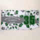 This sports themed beach towel for soccer players features a bunch of varied size green, grey & white soccer balls turned every which way on a white background - personalise with the athlete's name & jersey number plus team name & mascot name - by katz_d_zynes