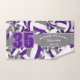 This team colours towel for volleyball players features varied size purple, grey & white volleyballs turned every which way on a white background and prominent jersey number in purple overlying a bold, full length grey colour strip, upon which you can also personalise the athlete's name, team name & mascot name - by katz_d_zynes