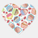 Heart sticker featuring design with lots of colourful cupcakes and red cherries on polka dot background.