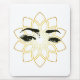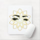 A line art representation of a Lotus flower and dark mysterious eyes.