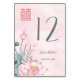 This contemporary Chinese wedding table number card features a watercolor painted lotus flower and a pink double xi symbol on a pink watercolor background.