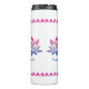 This thermal tumbler has three blue-pink coloured lotus flowers with editable text to promote a calm meditative drinks break. The three items of text for you to edit are: "THANKFUL" "HAPPY" and "JOYFUL". Around the top is a pattern echoing the bright pink petal of the lotus flower below. This is repeated around the bottom of the tumbler.