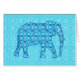 Mixed pattern digital graphic of a richly embellished elephant against an arabesque tiled background - turquoise, dark indigo blue and white lotus flower pattern against an aqua background