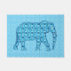 Doormat in a mixed media digital graphic of an elephant against an arabesque tiled background - turquoise, dark indigo blue and white lotus flower pattern against an aqua background