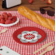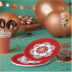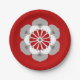 Japanese mandala design paper plate that depicts a stylised lotus flower, symbolising purity, spiritual awakening and faithfulness - flower in silver grey / grey, red and white, on a dark Chinese red background