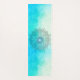 A black, drawn out ornate lotus mandala with an illuminating blue centre on a white and turquiose speckled, ombre backdrop. Hypnotic zen.