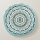 This mandala design features layers of white, turquoise and brown patterns inspired by Celtic weaves and Indian mehndi, such as vines, ribbons, and lotus flowers.