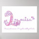 Pretty L monogram art name poster perfect for a girl's bedroom or playroom in shades of pink, purple, and a touch of lemon yellow. Personalize with your name beginning with L, and name meaning for a truly personalized touch to your child's bedroom or nursery, this example is for the name Louisa Renowned warrior. A capable intelligent leader. Cute poster print ideal for a new baby, christening or baby naming gift, or for a child's bedroom. © Unique letter L monogram hearts and flowers drawing and graphic art design by Sarah Trett for www.mylittleeden.com