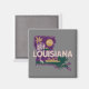Fridge magnet features retro style Louisiana state silhouette on medium grey background